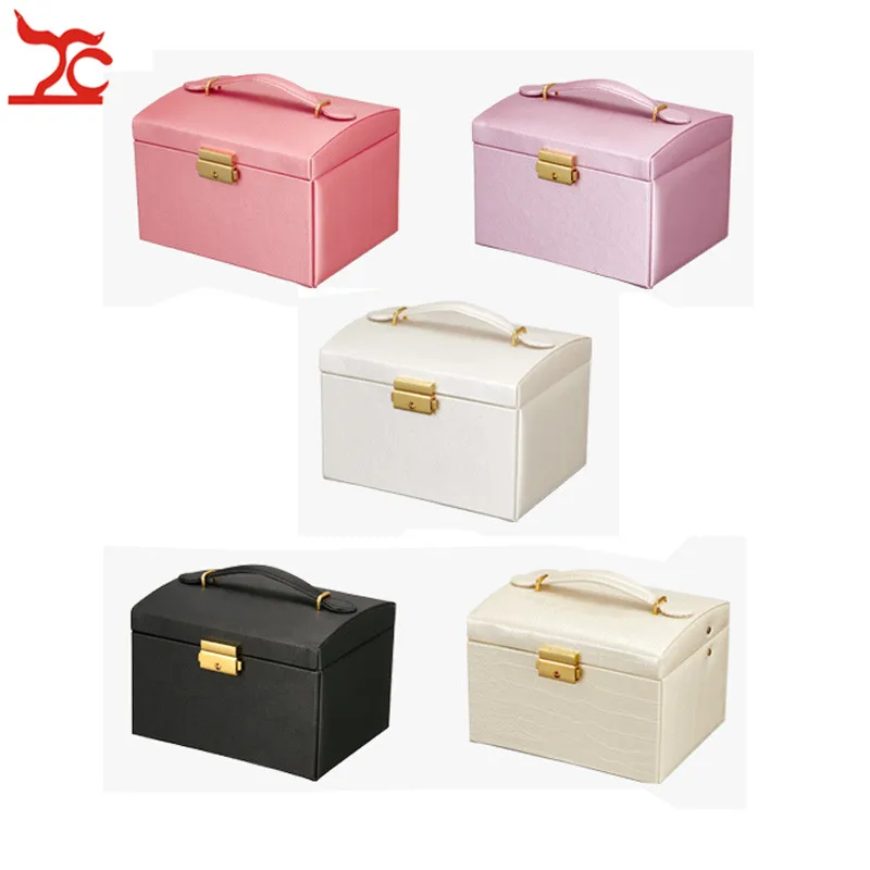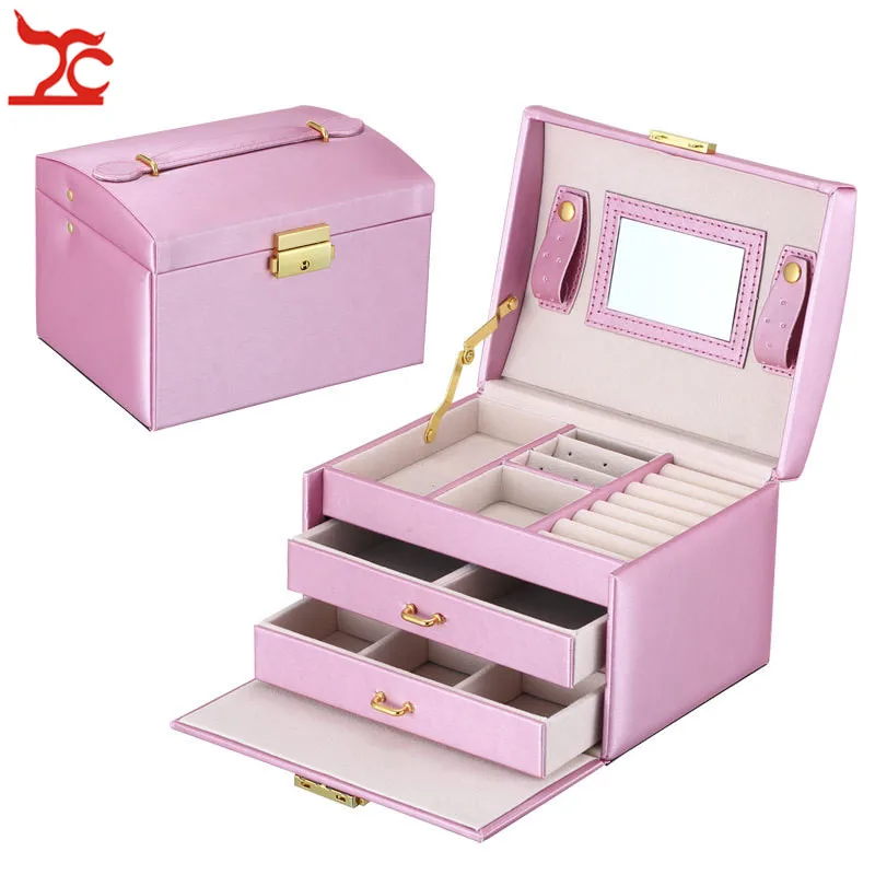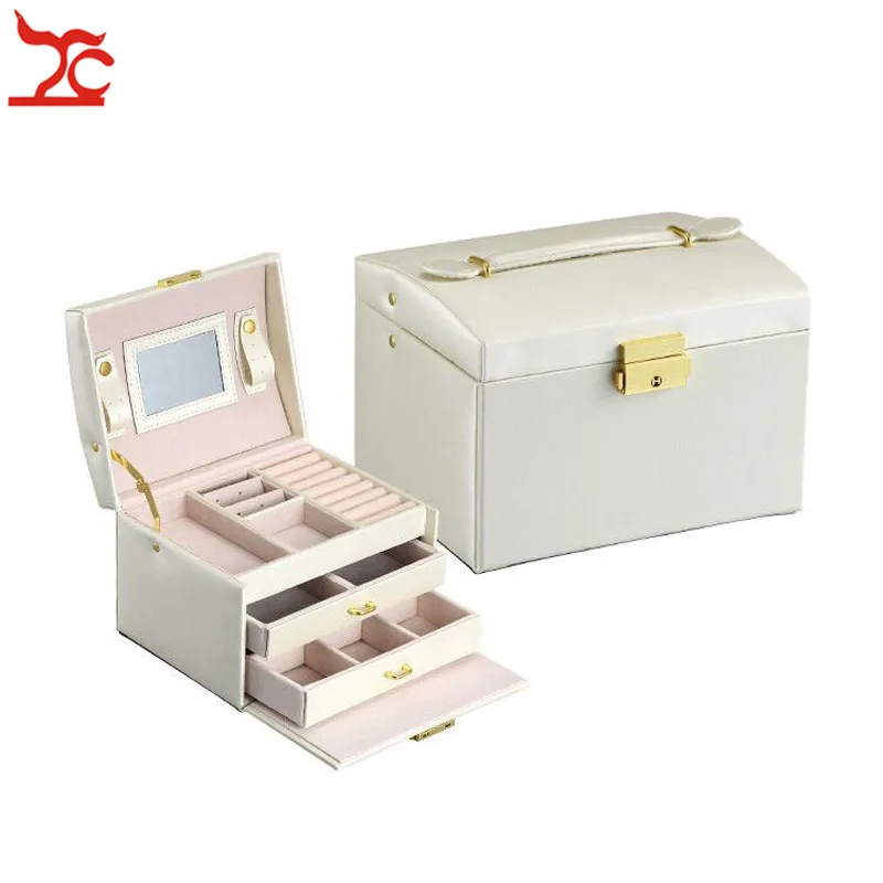 Fashion Luxury PU Three Layer Makeup Case Travel Jewelry Organizer with Lock and Mirror Gift for Je