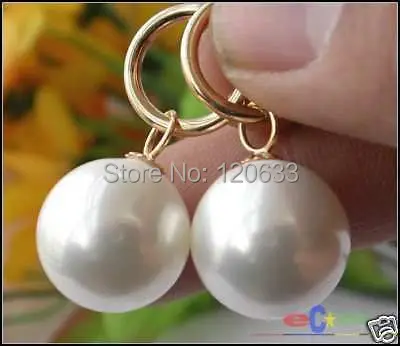 Hot Sale real natural beads Girl 14MM WHITE SOUTH SEA SHELL PEARL DANGLE EARRING [pair] earrings for women s