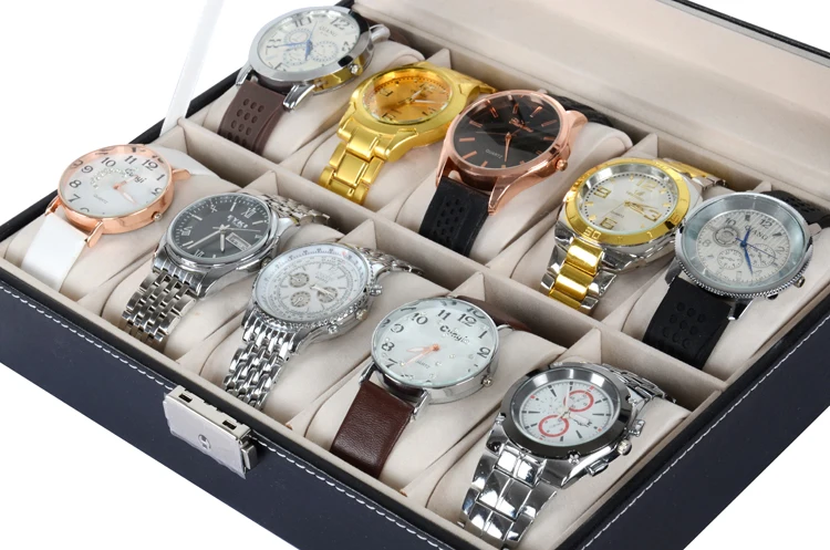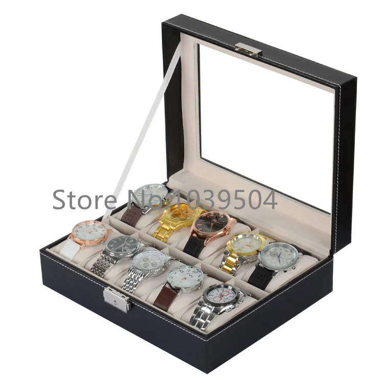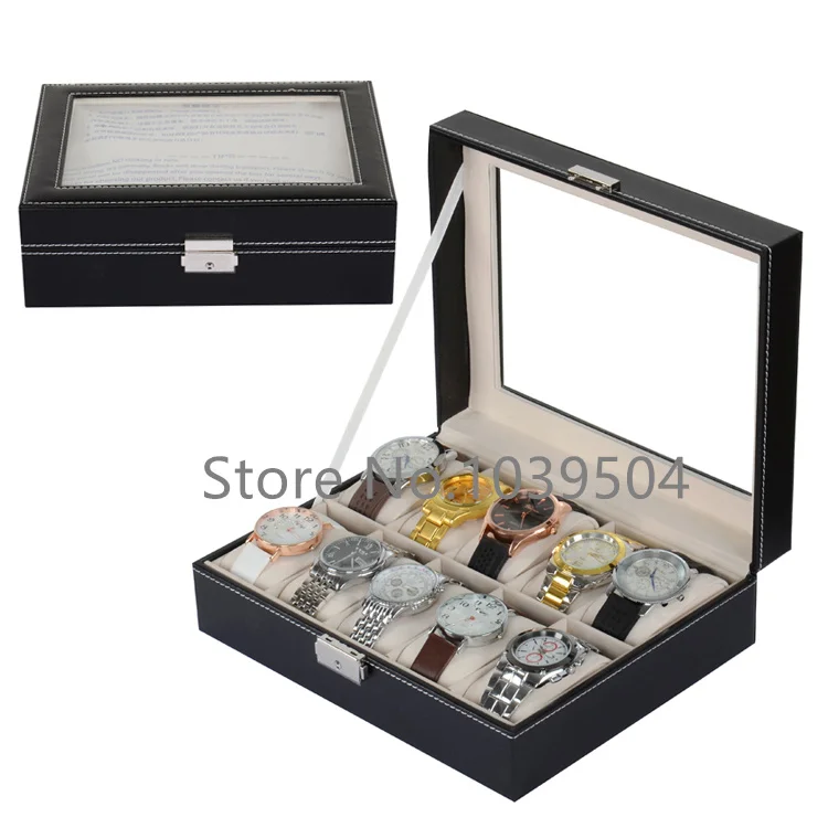 BEST Lateral Lock 10 Slots Watch Box Case New Black Leather Watch Display Organizer With Glass Storage J