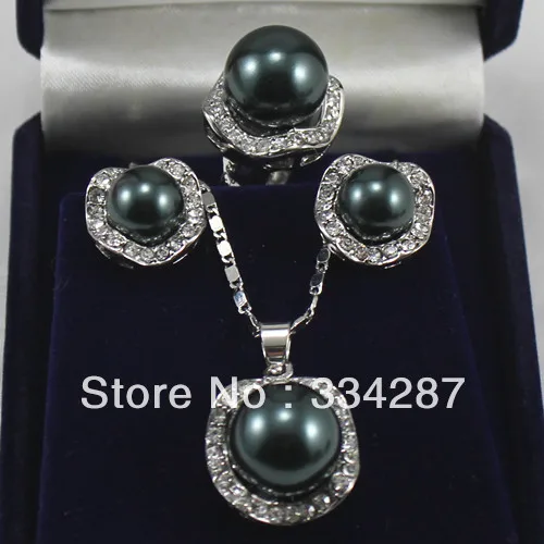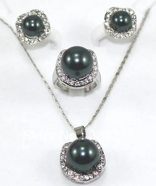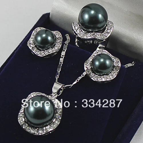 BEST QUALITY good Bridal Wedding Fine Jewelry Black South sea shell pearl earring pendant ring set 925 silver Fi