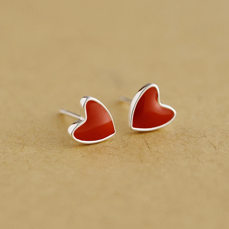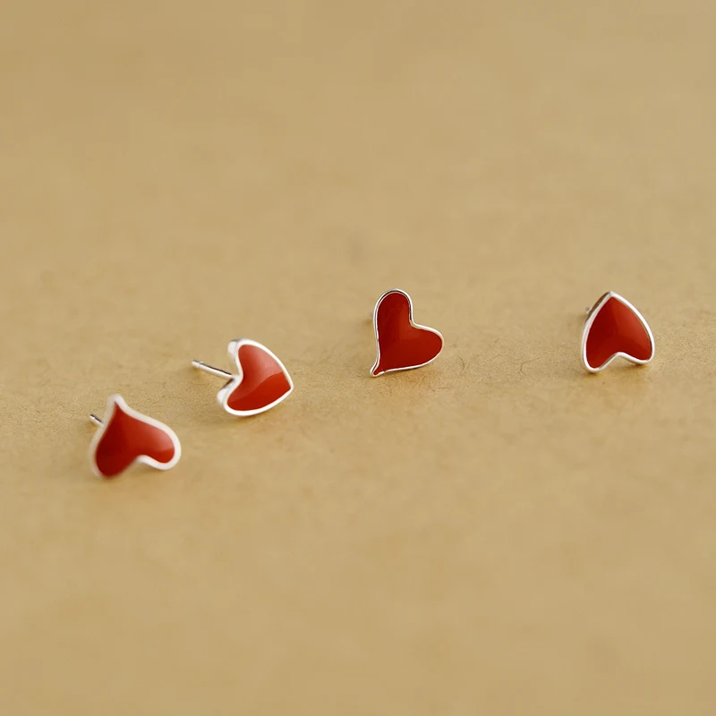 HOT Sale Enamel little red hearts stud earring asymmetrical red peach love earring 925 pure silver jewelry f